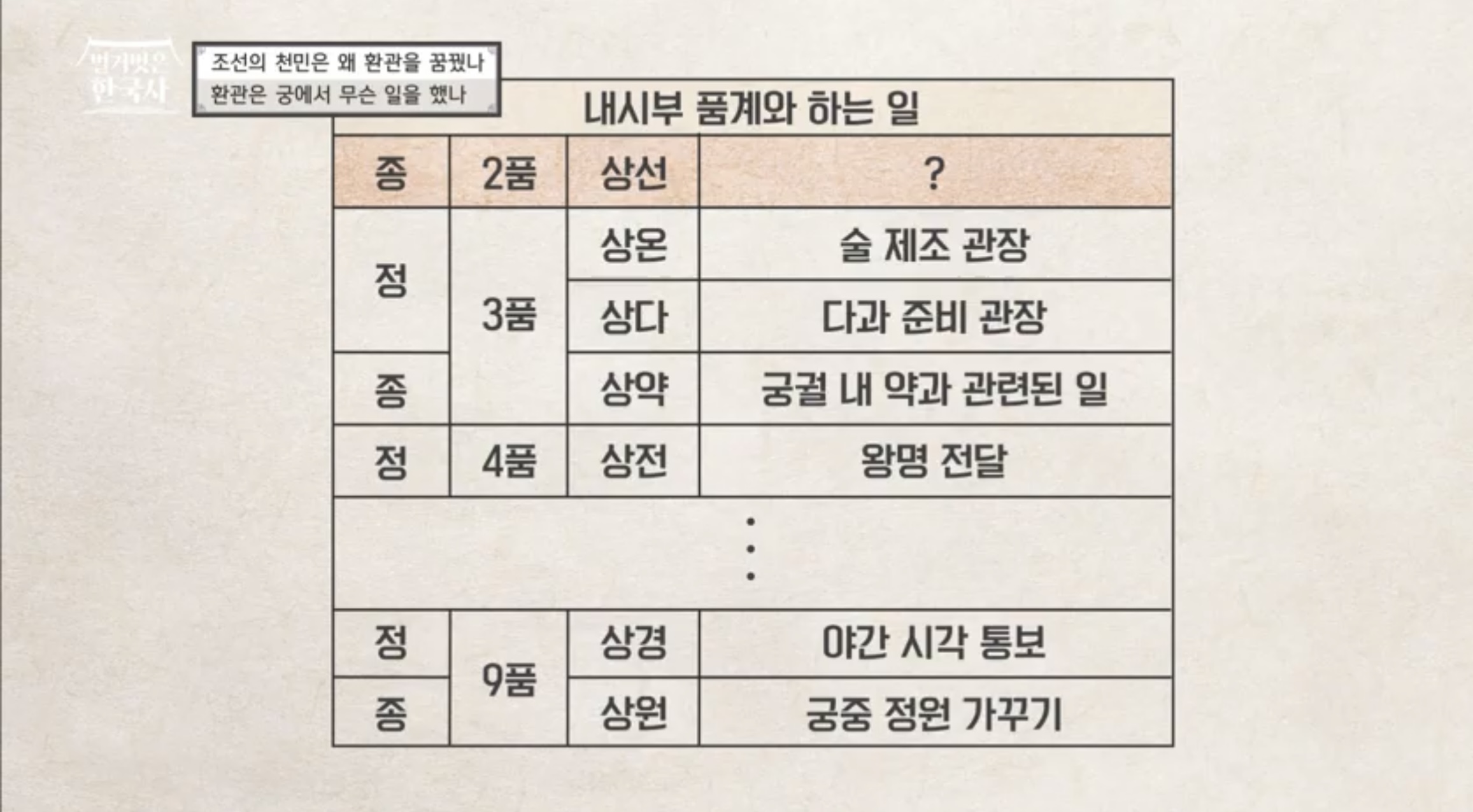 환관은 품계와 직급에 따라 역할이 나뉘어있는데 종 2품 상선은 궁 내 식사 감독을 맡았다.